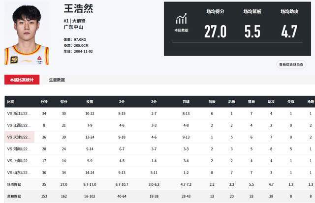 如今,在全運會的舞臺上,王浩然代表廣東U22男籃出戰,打得那是相當出色瞭,場均貢獻27.0分5.5籃板4.8助攻1.7搶斷,場均命中2.5記三分,外線命中率39.8%。