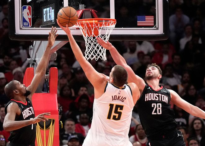 火箭主場迎戰掘金,火箭缺少瞭范弗利特、伊森、芬尼史密斯,掘金缺少瞭佈勞恩,比賽剛開打3分鐘,掘金大將戈登腿筋拉傷退出比賽,掘金少瞭戈登後沒有慌亂,他們首節取得13分領先,第二節謝潑德單節18分幫助火箭反超3分,第三節約基奇單節18分帶領掘金重新領先2分。第四節還剩23秒時掘金領先6分,火箭在還剩6秒時把分差追到1分,約基奇2罰2中後申京超遠三分不中,掘金3分優勢擊敗火箭。約基奇20中11(三分8中4)得到34分10板9助2斷,穆雷16中10得到26分2板10助,火箭方面謝潑德13中9(三分8中5)得到27分4助2斷,阿門18中10得到22分7板2助2斷。