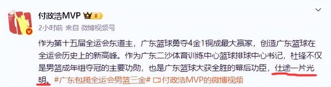 而知名媒體人付政浩也是大贊杜鋒,用六字描繪瞭他的仕途,付政浩表示,作為第十五屆全運會東道主,廣東籃球勇奪4金1銅成最大贏傢,創造廣東籃球在全運會歷史上的新高峰。作為廣東二沙體育訓練中心籃球排球中心書記,杜鋒不僅是男籃成年組奪冠的主要功勛,也是廣東籃球大獲全勝的幕後功臣,仕途一片光明。