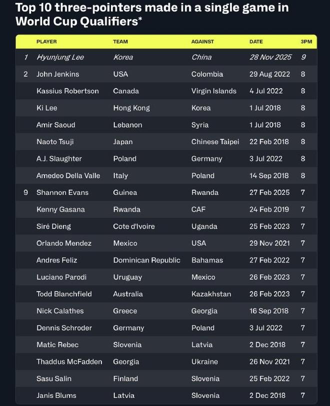 本場比賽,韓國球星李賢重發揮出色,尤其是他命中瞭9記三分。據FIBA官方統計,李賢重創下瞭FIBA自2017年實施新的世預賽制度後的個人單場三分命中數紀錄。此前的紀錄為8記三分。