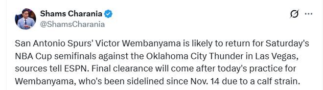 北京時間12月13日,據名記Shams報道,馬刺隊球星文班亞馬預計將在周日對陣雷霆的NBA杯半決賽中復出。馬刺已正式將文班亞馬列為大概率出戰球員。