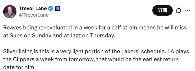 受NBA杯的影響,湖人未來一周隻有兩場比賽,分別是12月15日客場對陣太陽以及12月19日客場對陣爵士。如果裡夫斯能在一周後回歸,他預計會缺席這兩場比賽。他最快可以在下周對快船的比賽中復出。
