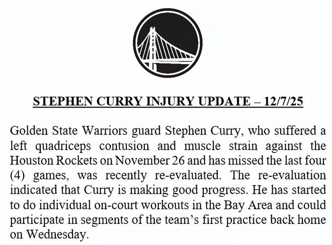 官方公告寫道:金州勇士後衛斯蒂芬-庫裡於11月27日(北京時間,下同)對陣休斯頓火箭的比賽中遭遇左股四頭肌挫傷及肌肉拉傷,此後已缺陣4場賽事。球隊近期對其傷情進行瞭復查,結果顯示庫裡恢復情況良好。他已在灣區開啟個人場內訓練,有望在周四球隊回到主場後的首堂訓練課中參與部分環節。