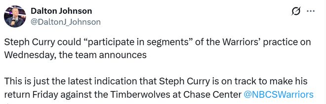 隊記Dalton Johnson轉發瞭勇士的公告,並表示這進一步表明庫裡有望在本周六主場對森林狼的比賽中復出。