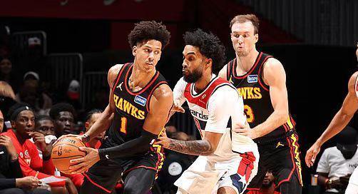 老鷹過去3場連輸活塞、快船與掘金遭遇3連敗,奇才過去兩場連輸76人與凱爾特人遭遇2連敗。本場老鷹缺少特雷-楊、波爾津吉斯、托平等,奇才缺少米德爾頓、庫利巴利、薩爾與基斯珀特等。首節開局老鷹4-10落後,老鷹之後繼續被壓制12-18落後,傑倫攻傳結合引領一波23-5攻勢反超12分。奇才連得5分,首節結束老鷹35-28領先奇才。老鷹27中12超過5成準星,但三分8中1,傑倫6中5得到11+3+3,奇才20中10,其中三分10中4。
