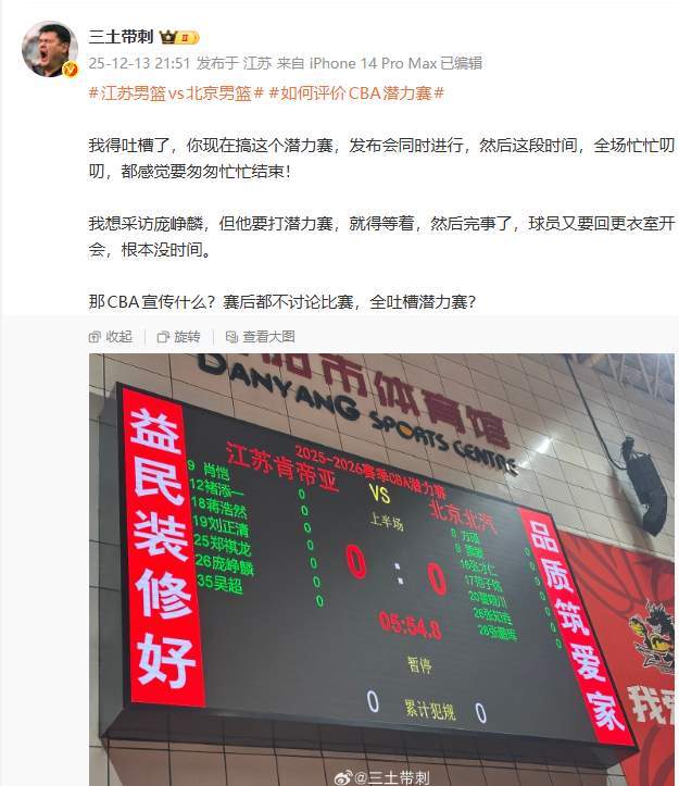 北京時間12月13日消息,2025-26賽季CBA常規賽第一輪全面開打,北京首鋼男籃客場以84-74擊敗江蘇男籃,拿到瞭賽季開門紅。隨後進行的潛力賽,北京男籃的首發,直接叫人驚呆瞭,首發5人加起來154歲,說好瞭鍛煉年輕人呢?如此潛力賽,難怪又遭吐槽瞭,連名嘴楊毅都忍不住瞭:北京首鋼太有潛力瞭。