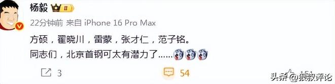 媒體人楊毅發文點評:“方碩,翟曉川,雷蒙,張才仁,范子銘。