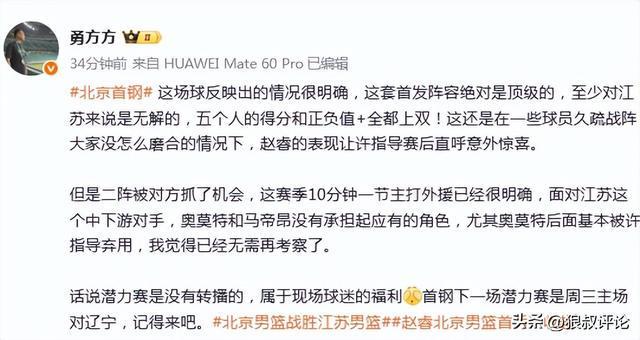 媒體人“勇方方”發文點評:這場球反映出的情況很明確,這套首發陣容絕對是頂級的,至少對江蘇來說是無解的,五個人的得分和正負值+全都上雙!這還是在一些球員久疏戰陣大傢沒怎麼磨合的情況下,趙睿的表現讓許指導賽後直呼意外驚喜。