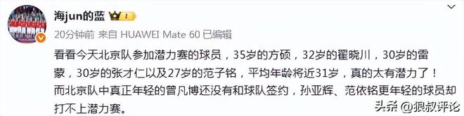 媒體人“海jun的藍”發文點評:“看看今天北京隊參加潛力賽的球員,35歲的方碩,32歲的翟曉川,30歲的雷蒙,30歲的張才仁以及27歲的范子銘,平均年齡將近31歲,真的太有潛力瞭!