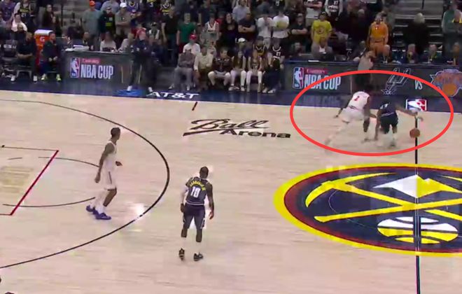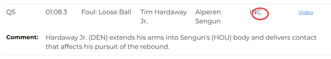 第二次是漏判,發生在距離比賽結束還有1分8秒,申京拼搶籃板時,突然摔倒在地,裁判沒有任何回應。裁判報告指出,這一個回合是小哈達威伸手推在申京的身上,這次身體接觸幹擾瞭申京的籃板拼搶。這是一次漏吹的搶籃板犯規,同樣是掘金獲利,火箭吃虧。