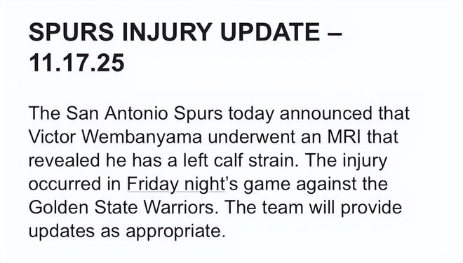 馬刺記者Wright在社媒上寫道:“昨晚在更衣室看到瞭文班亞馬,他受傷的小腿上套瞭個小護套。看起來他沒什麼不適,精神狀態也不錯。但大傢都知道,馬刺隊總是會格外謹慎——尤其是在小腿拉傷這種情況下。”