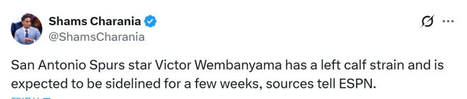 “聯盟消息人士透露,馬刺隊將在兩到三周後重新評估文班亞馬的傷情,他至少會休戰兩周。鑒於近期有多起小腿傷勢後續惡化的情況出現,馬刺隊此次處理格外謹慎。另外說句供參考的話,據稱文班亞馬本人感覺並無大礙。”