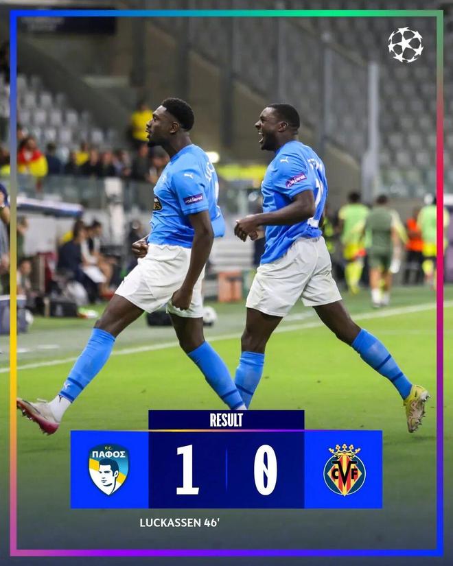 欧冠今夜见证历史,塞浦路斯球队帕福斯主场1-0战胜比利亚雷亚尔,欧冠新军取得了队史正赛首胜。