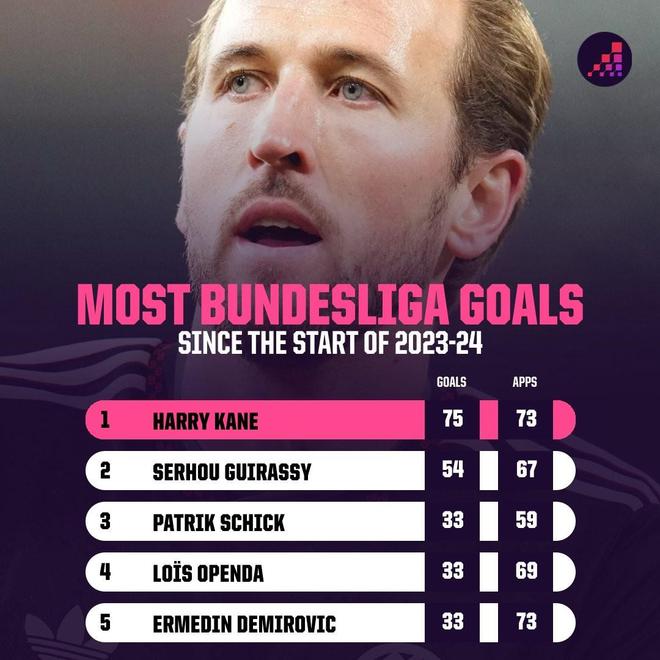 本赛季德甲第10轮,拜仁客场2-2战平柏林联合,凯恩在补时阶段头球绝平。这场比赛后,凯恩在73场德甲比赛中已打入75球。自2023/24赛季德甲首秀后,凯恩位列同期球员进球数第一。2023/24赛季后