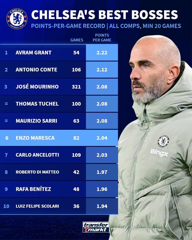 賽後來自德轉的統計指出,此戰取勝之後,馬雷斯卡執教切爾西各項賽事82場比賽的場均積分達到瞭2.04分,他也就此超越瞭自己的同胞安切洛蒂,成為執教切爾西至少20場比賽場均積分排名第6的主教練。