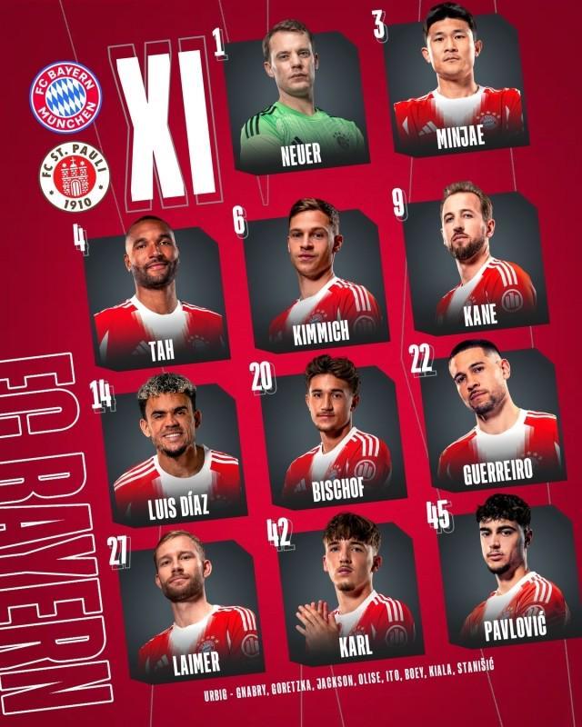 【首发】奥利塞轮休,凯恩劳模依旧德甲 11-29 21:19北京时间11月29日22:30,德甲第12轮,拜仁慕尼黑主场迎战圣保利。拜仁公布首发,劳模凯恩领衔锋线,迪亚斯先发,奥利塞轮休。与帕梅卡诺缺