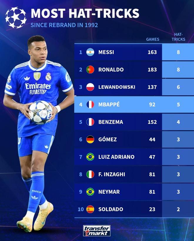 欧冠92年改制后戴帽数前10:梅西、C罗8次第1,姆巴佩5次第4