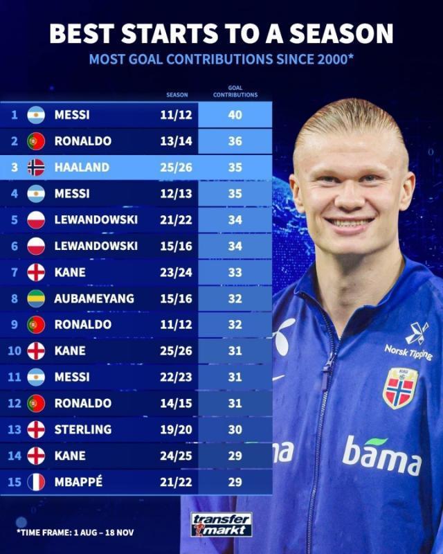 11月20日訊 德轉統計瞭本世紀賽季開局的進球貢獻數,哈蘭德以35粒進球位居歷史第三,僅次於梅西和C羅。