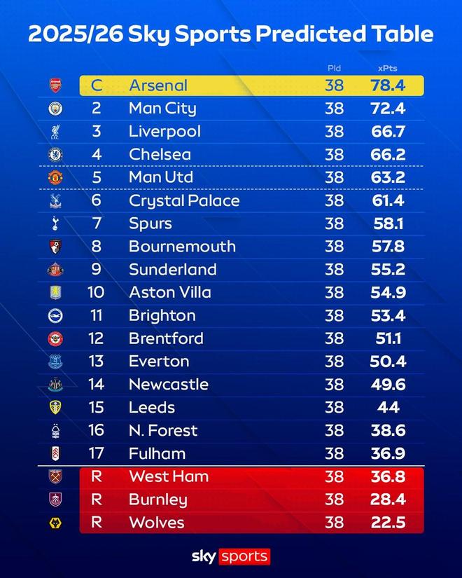在本周末英超戰火重燃之前,《天空體育》預測瞭本賽季英超聯賽各球隊的最終排名,阿森納奪冠,曼城、利物浦緊隨其後,切爾西排在第四,曼聯則在第五。