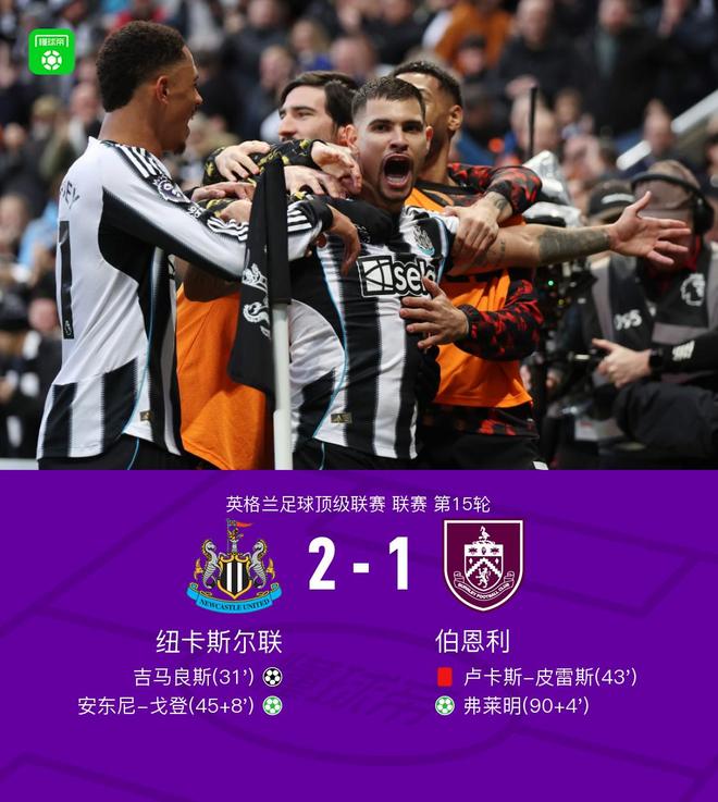 北京時間12月6日英超聯賽 第15輪,紐卡斯爾聯主場對陣伯恩利。上半場,吉馬良斯直接角球破門。盧卡斯-皮雷斯放倒埃蘭加吃到紅牌。烏戈舒庫手球送點,安東尼-戈登點球命中。下半場,拉姆齊手球送點,弗萊明點射破門扳回一城。最終紐卡斯爾主場2-1力克伯恩利。