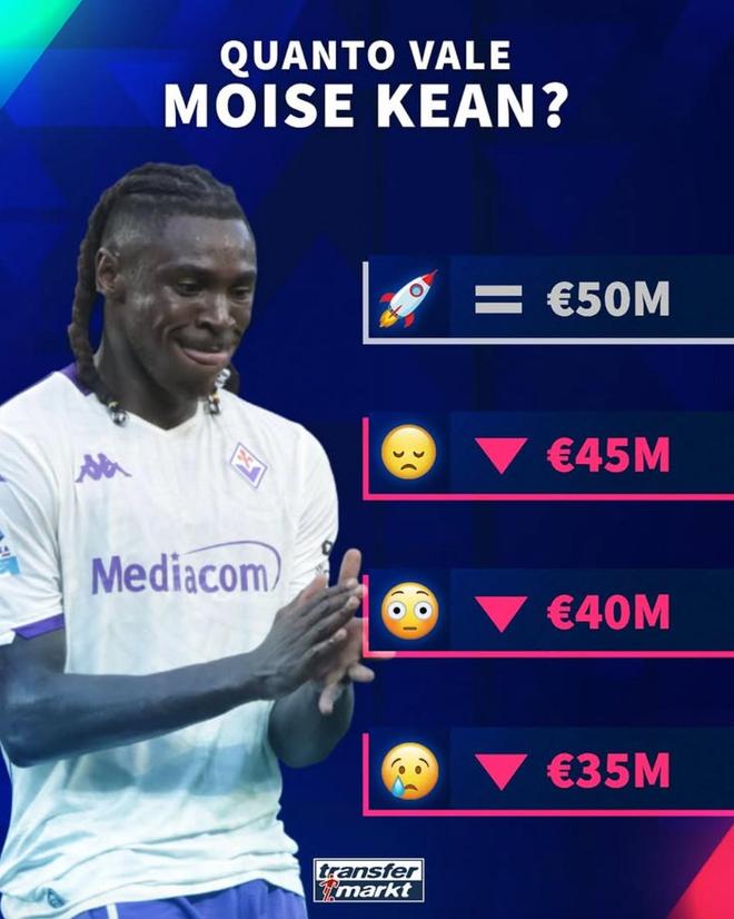 德轉將在12月23日更新意甲球員的身價,在莫伊塞-基恩本賽季表現不佳的情況下,德轉為這位意大利球星給出的四個身價更新選項分別為維持5000萬歐元不變、下跌至4500萬歐元、下跌至4000萬歐元以及下跌至3500萬歐元。