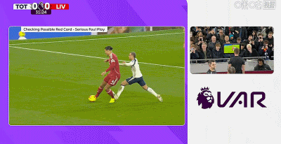 第33分鐘,哈維-西蒙斯踩踏范戴克小腿,VAR確認後被紅牌罰下,熱刺少一人作戰!