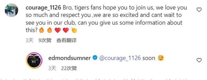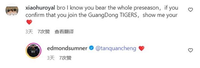 如今薩姆納在社媒與網友互動時,他被網友問到希望他能夠加盟廣東男籃。薩姆納本人確認表示“很快”。另一位網友表示如果確認將加盟廣東男籃就貼出一個紅心表情,薩姆納也是回復一個紅心表情進行確認。