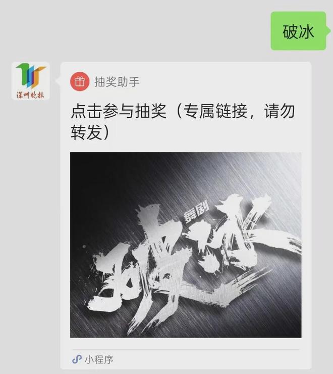 3、在對話框中輸入關鍵詞“破冰”,獲取鏈接參與抽獎