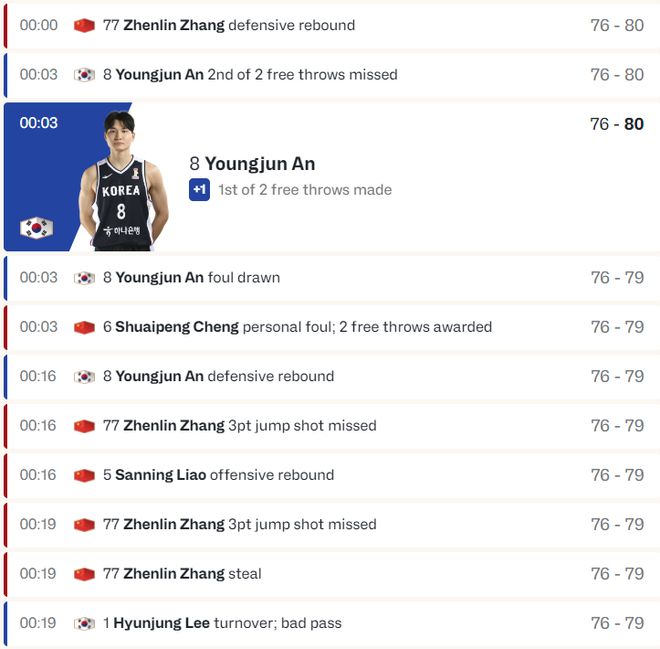 終場前19秒張鎮麟搶斷成功,隨後出手絕平三分未能命中,廖三寧又拼下一個前場籃板傳給張鎮麟,終場前16秒張鎮麟三分出手但未能命中,這兩個絕平三分投丟後中國男籃已經無力回天,程帥澎的犯規預示著男籃逆轉失敗。
