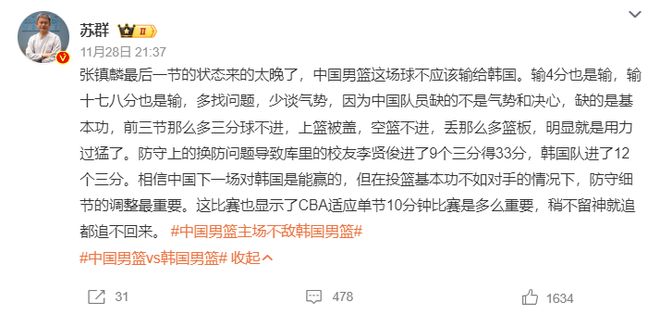 賽後蘇群老師說張鎮麟最後一節的狀態來的太晚,中國男籃球員缺的不是氣勢和決心而是基本功,前三節各種空位三分不中,上籃被帽,空籃不進,各種丟籃板。