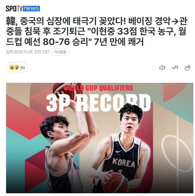 韓媒還報道,李賢重此役面對中國隊單場命中9個三分球創造瞭世預賽單場三分紀錄,這不是亞太區的三分紀錄,而是全球世預賽的紀錄,此前的紀錄是單場8個:詹金斯(美國)、羅伯遜(加拿大)、薩烏德(黎巴嫩)、斯洛特(波蘭)、德拉瓦萊(意大利)、辻直人(日本)、阿梅迪奧(意大利)。