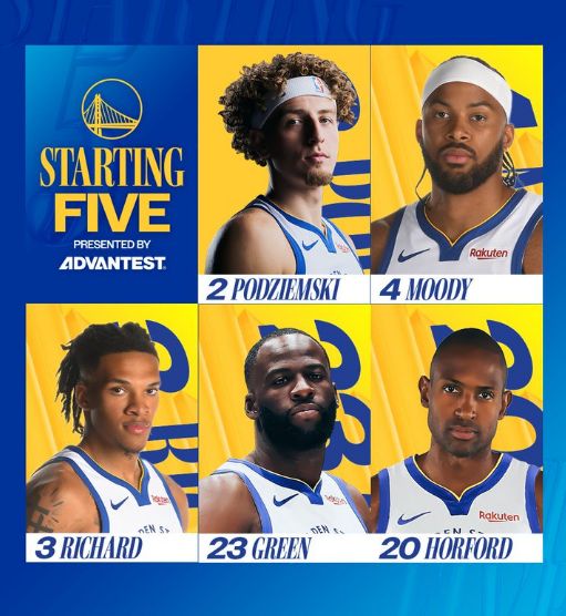 勇士兩大核心缺席,庫裡繼續因傷缺席,上一場傷退的巴特勒也缺席,追夢領銜首發五人組,梅爾頓復出迎來新賽季首秀。
