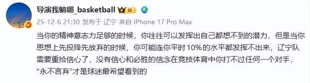 難怪遼寧媒體人導演我躺哪就就忍不住瞭,一針見血指出瞭遼寧男籃的癥結。他是這樣說的:“當你的精神意志力足夠的時候,你往往可以發揮出自己都想不到的潛力,但是當你思想上先投降先放棄的時候,你可能連你平時10%的水平都發揮不出來,遼寧隊需要重拾信心瞭,沒有信心和必勝的信念在競技體育中你打不過任何一個對手,‘永不言棄’才是球迷最希望看到的。”