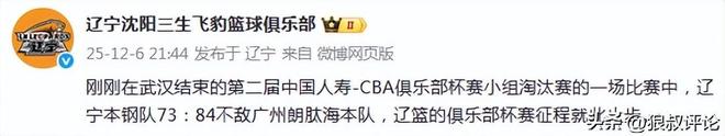 遼寧男籃官方賽後發文:剛剛在武漢結束的第二屆中國人壽-CBA俱樂部杯賽小組淘汰賽的一場比賽中,遼寧本鋼隊73:84不敵廣州朗肽海本隊,遼籃的俱樂部杯賽征程就此止步。