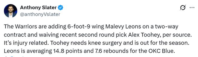 北京時間12月9日,勇士隊記Slater報道,消息人士透露,勇士隊將簽下身高2米06的側翼球員馬萊維-萊昂斯,合同為雙向合同,同時裁掉今年的52號秀亞歷克斯-圖希。據悉,裁員與傷病有關,圖希需要接受膝蓋手術,賽季報銷。萊昂斯目前效力於G聯賽的俄克拉荷馬城藍隊,場均貢獻14.8分和7.6籃板。