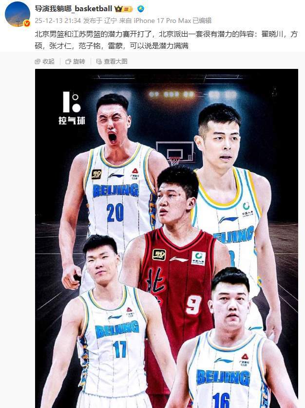 遼寧媒體人導演我躺哪也來吐槽瞭,“北京男籃和江蘇男籃的潛力賽開打瞭,北京派出一套很有潛力的陣容:翟曉川,方碩,張才仁,范子銘,雷蒙,可以說是潛力滿滿”。