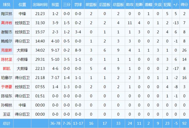 數據方面,山東隊隻有3名球員得分上雙。其中,克裡斯26分9籃板4助攻,得分全隊最高;珀塞爾得到16分;陳林堅三分球5投3中,貢獻14分。北控則有6人得分上雙,其中裡勒砍下全場最高的36分,外加7助攻3籃板3搶斷。