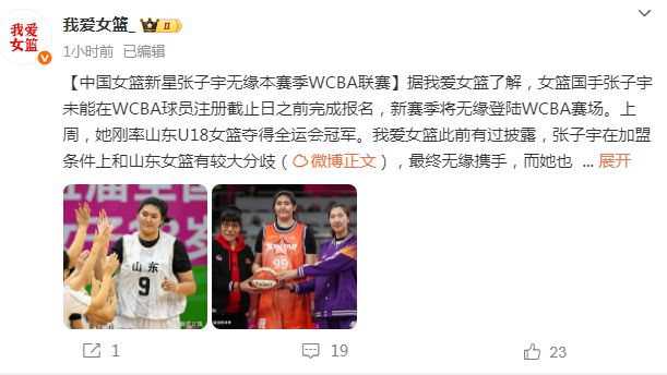北京時間11月19日,根據媒體人我愛女籃報道,中國女籃國手張子宇未能在WCBA球員註冊截止日之前完成報名,她將無緣新賽季的WCBA賽事。張子宇雖然上周率領山東U18女籃在全運會奪冠,但她與山東女籃存在較大分歧導致尚未能夠完成簽約。