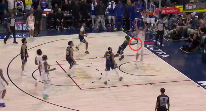 第二次是漏判,發生在距離比賽結束還有1分8秒,申京拼搶籃板時,突然摔倒在地,裁判沒有任何回應。裁判報告指出,這一個回合是小哈達威伸手推在申京的身上,這次身體接觸幹擾瞭申京的籃板拼搶。這是一次漏吹的搶籃板犯規,同樣是掘金獲利,火箭吃虧。