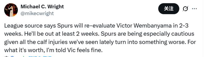 “聯盟消息人士透露,馬刺隊將在兩到三周後重新評估文班亞馬的傷情,他至少會休戰兩周。鑒於近期有多起小腿傷勢後續惡化的情況出現,馬刺隊此次處理格外謹慎。另外說句供參考的話,據稱文班亞馬本人感覺並無大礙。”