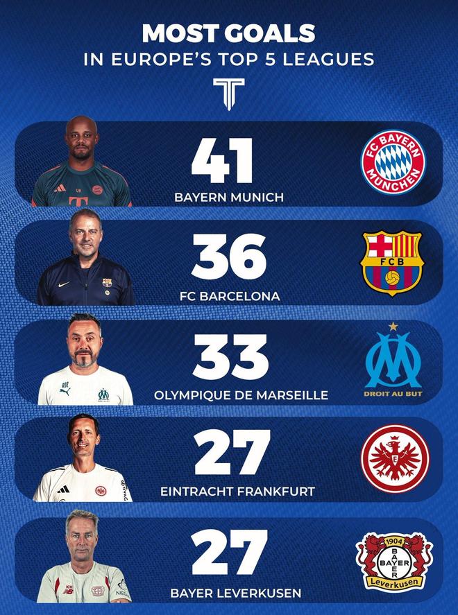 北京时间11月24日,The Touchline统计出了本赛季至今欧洲五大联赛进球最多的五支球队,三支德甲球队入围,11轮德甲狂轰41球的拜仁慕尼黑领跑,巴塞罗那13轮西甲打进36球排名第二。本赛季至