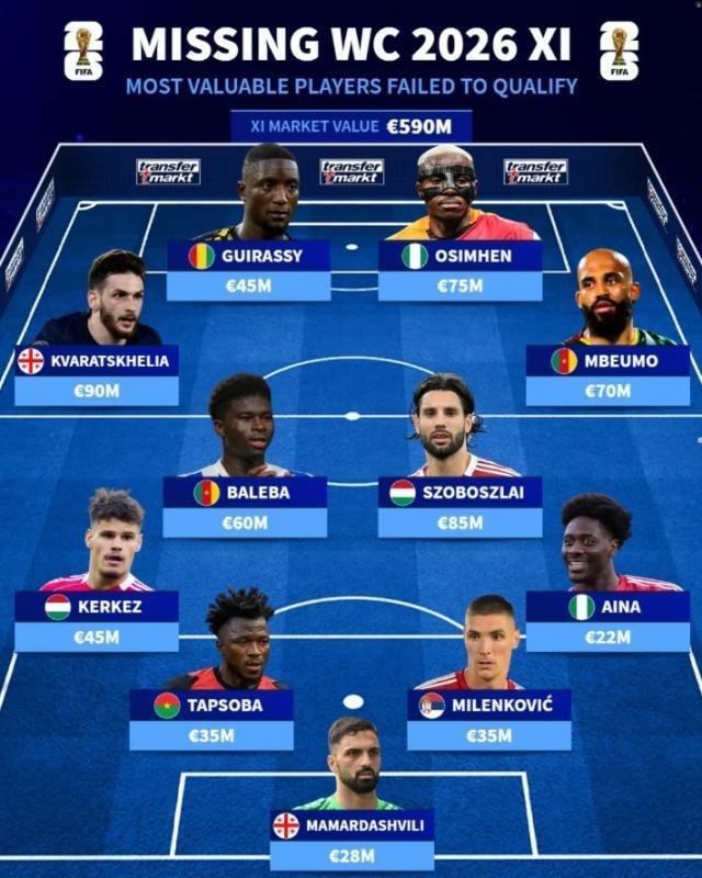 11月19日訊 德轉社媒曬圖,列出無緣2026世界杯球員中身價最高的首發陣容,奧斯梅恩、姆伯莫、K77、索博斯洛伊等多名球星在列。