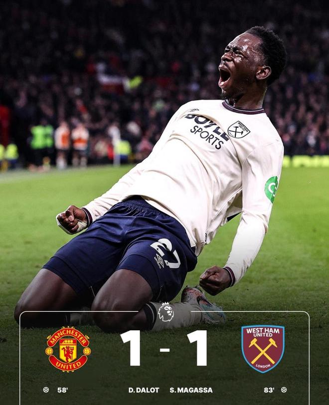 隨後曼聯的老毛病又來瞭,領先後的防線松懈,第83分鐘,西漢姆右側角球開出,鮑文前點一蹭,本來馬茲拉維已經門線救險,卻將球解圍到對方腳下。馬加薩面對大好機會冷靜推射入網,1-1準絕平。煮熟的鴨子飛瞭,曼聯不僅丟掉2分,還錯失重返前五的最好機會。目前僅排名聯賽第八,阿莫林的壓力又來瞭。