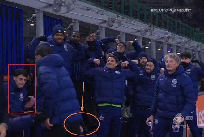 事情是這樣的,如下圖中黃色圓圈標記出的位置;在皮奧-埃斯波西托被替換下場時,直播鏡頭捕捉到瞭國米替補席這樣的一個有趣的一幕,大傢都站起來模仿皮奧慶祝進球的動作,以表達對他的鼓勵、喜愛亦或者是調侃。但這裡面唯獨少瞭一個人,誰呢?沒錯,狗哥特意為此會看瞭一遍比賽錄像,一幀一幀的看,發現這個位置坐著的人,正是勞塔羅