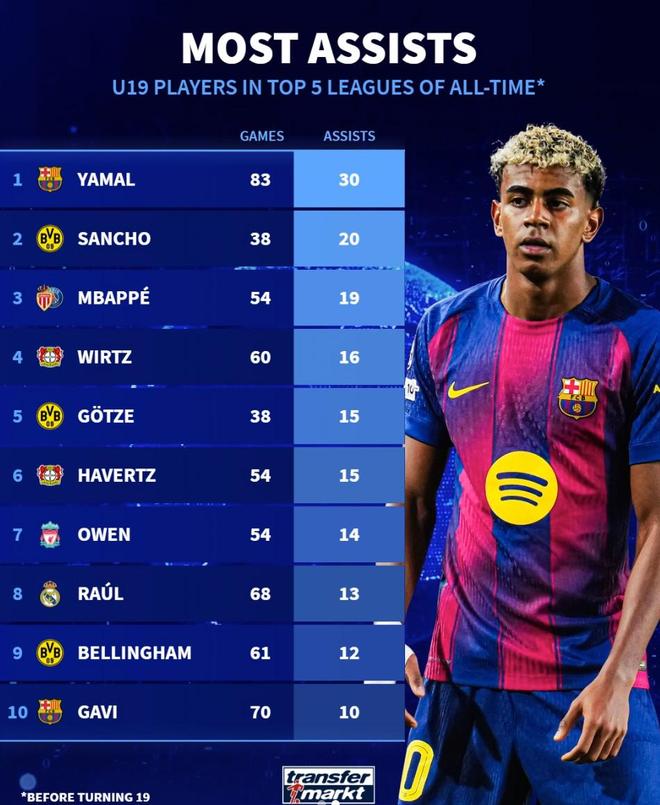 北京时间12月2日,德转统计出了欧洲五大联赛历史U19球员的助攻榜,亚马尔以83场比赛助攻30次高居第一,桑乔和姆巴佩位列第二和第三位。