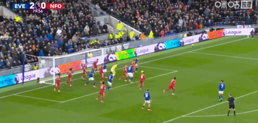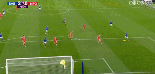 第80分鐘,霍爾禁區內低射破門,埃弗頓3-0森林