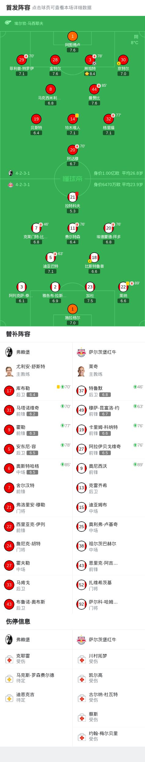 欧足联欧洲联赛联赛阶段第6轮,弗赖堡迎战萨尔茨堡红牛。比赛中,萨尔茨堡红牛球员拉特科夫被罚离场。随后,弗赖堡由林哈特攻入制胜进球。最终,弗赖堡以1-0战胜对手。精彩瞬间第38分钟,萨尔茨堡红牛球队拉特