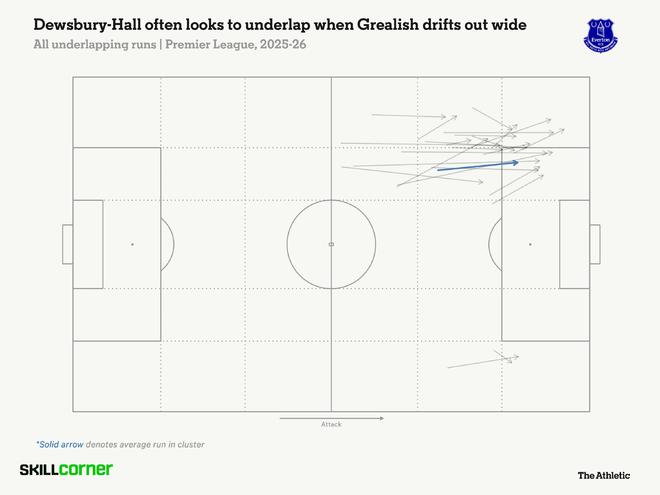 在歐洲五大聯賽至少出場10次的中場球員中,隻有森林隊的埃利奧特-安德森(31次)的“內套插上跑動”次數超過瞭他的26次。我們可以看到,其中很大一部分是那些從左路內套插入禁區的跑動。其中一半是在格拉利什持球時進行的,顯示瞭兩人的配合頻率。這有助於埃弗頓成為一支更具創造力和變化多端的進攻力量。
