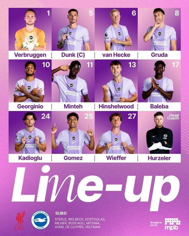 佈萊頓首發:1-費佈魯亨、13-欣謝爾伍德、5-鄧克、6-范黑克、27-魏費爾、25-迭戈-戈麥斯、17-巴萊巴、11-明特、8-格魯達、24-卡迪奧盧、10-呂特