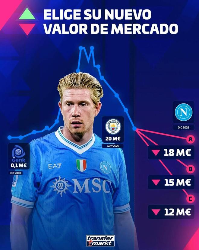 德轉將在12月23日更新意甲球員身價,此次預熱德佈勞內的身價他們給出瞭三個選項,分別為下跌至1800萬歐元、下跌至1500萬歐元以及下跌至1200萬歐元。